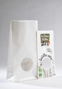 Nowadays we use 500 gr and 1 kg bags. It’s a glossy white bag that we can seal, with a round window to display the product.