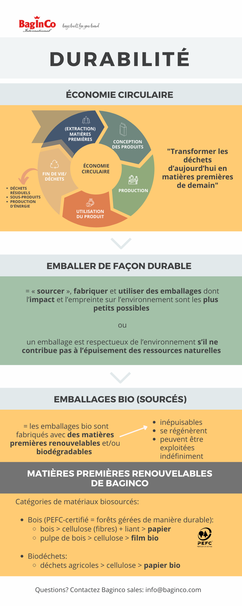 On parle parfois aussi de matières premières renouvelables végétales, qui incluent le bois et le bambou, mais aussi par ex. le maïs, la canne à sucre, les pommes de terre, etc. Cependant, chez Baginco, nous préférons ne pas utiliser ces matières premières vu qu’elles sont destinées à l’alimentation humaine et que nous ne voulons pas encourager leur utilisation sous forme d’emballages.