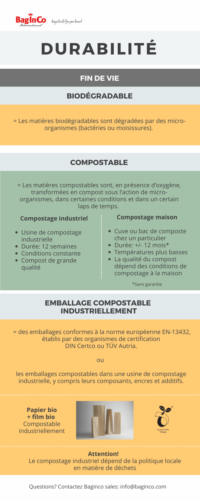 Les emballages bio sont des emballages fabriqués avec des matières premières renouvelables et/ou biodégradables. Un emballage biodégradable n’est donc pas forcément compostable.
