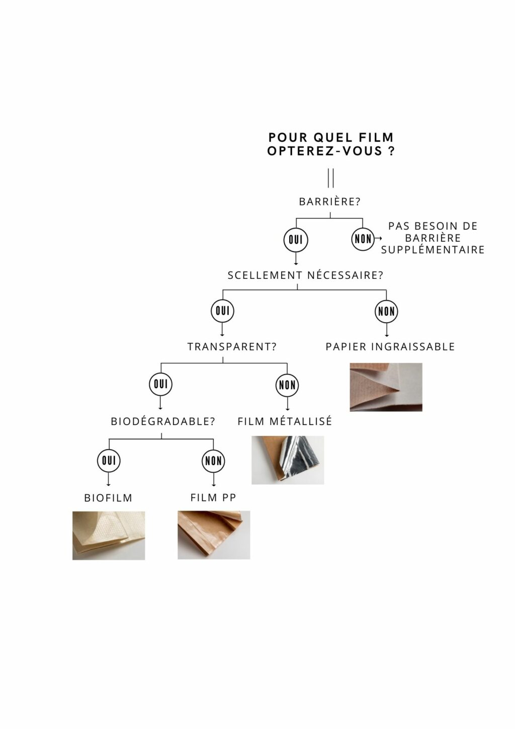 Les possibilités sont infinies ! Tous les papiers que nous proposons peuvent être combinés avec un film ou un papier (ingraissable). Saviez-vous que pas moins de 43 combinaisons sont possibles ? Mais ne vous inquiétez pas : il vous suffit de suivre les étapes ci-dessous pour faire le bon choix !